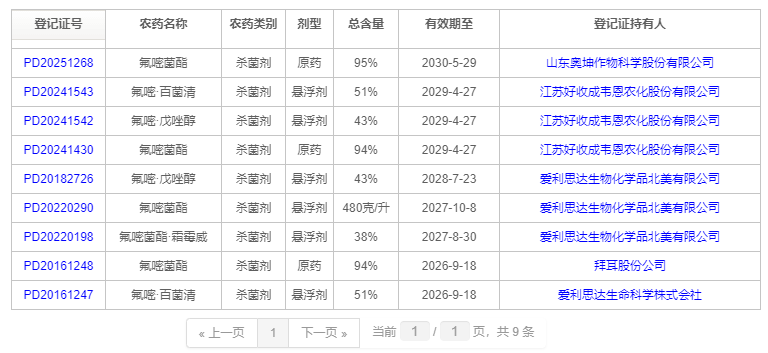 随着2017年化合物专利到期,国内企业纷纷启动登记工作。截至2017年3月,我国获得田间试验批准的氟嘧菌酯产品有18个,其中单剂5个,复配产品13个,配伍产品包括戊唑醇、苯醚甲环唑、丙硫菌唑、申嗪霉素和烯酰吗啉等。