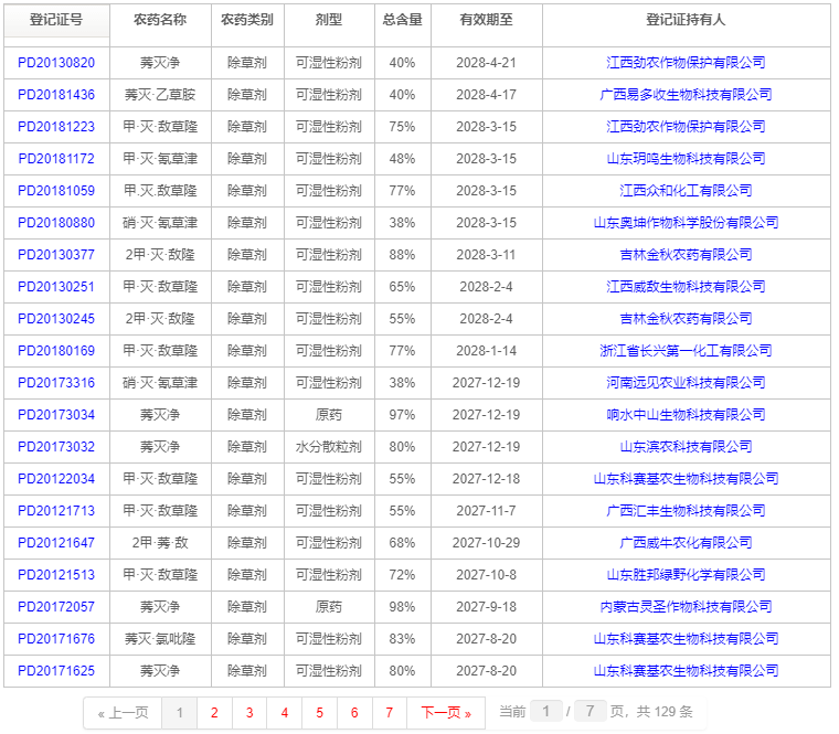 经中国农药信息网查询,截至2022年1月14日,我国莠灭净登记的有效证件有129个,其中,原药9个,单剂34个,复配制剂86个。目前莠灭净市场上主要以可湿性粉剂为主,单剂中可分散粉剂有23个,占67.6%,其他剂型为水分散粒剂和悬浮剂,有效登记证分别为5个和6个;复配剂中可湿性粉剂有82个,占95%。